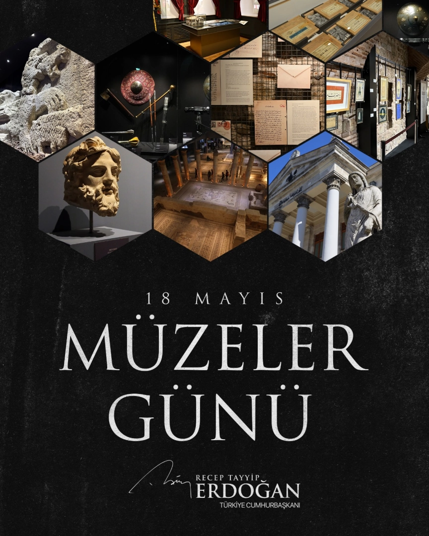 İSTANBUL, (DHA)- CUMHURBAŞKANI Recep Tayyip Erdoğan, 18 Mayıs Müzeler Günü nedeniyle sosyal medya hesabından kutlama mesajı yayınladı.Cumhurbaşkanı Erdoğan'ın sosyal medyadan yayınladığı mesajda “Hızla Değişen Toplumlarda Müzelerin Geleceğiö temasıyla icra edilen Müzeler Günü’nü tebrik ediyorum. 'Müzekart GNS Kart' ile müze girişlerini ücretsiz hale getirdiğimiz gençlerimiz ve çocuklarımız başta olmak üzere, tüm vatandaşlarımı müzelerimizi ziyaret etmeye, zengin kültürel hazinelerimizi keşfetmeye davet ediyorum." ifadelerine yer verildi. (DHA)