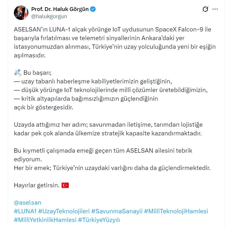 Savunma Sanayii Başkanı Haluk Görgün, konuya ilişkin sosyal medya hesabından açıklama yaptı. Görgün, "ASELSAN'ın LUNA-1 alçak yörünge IoT uydusunun SpaceX Falcon-9 ile başarıyla fırlatılması ve telemetri sinyallerinin Ankara'daki yer istasyonumuzdan alınması, Türkiye'nin uzay yolculuğunda yeni bir eşiğin aşılmasıdır. Bu başarı; uzay tabanlı haberleşme kabiliyetlerimizin geliştiğinin, düşük yörünge IoT teknolojilerinde milli çözümler üretebildiğimizin, kritik altyapılarda bağımsızlığımızın güçlendiğinin açık bir göstergesidir. Uzayda attığımız her adım; savunmadan iletişime, tarımdan lojistiğe kadar pek çok alanda ülkemize stratejik kapasite kazandırmaktadır. Bu kıymetli çalışmada emeği geçen tüm ASELSAN ailesini tebrik ediyorum. Her bir emek; Türkiye'nin uzaydaki varlığını daha da güçlendirmektedir. Hayırlar getirsin" dedi. (DHA)